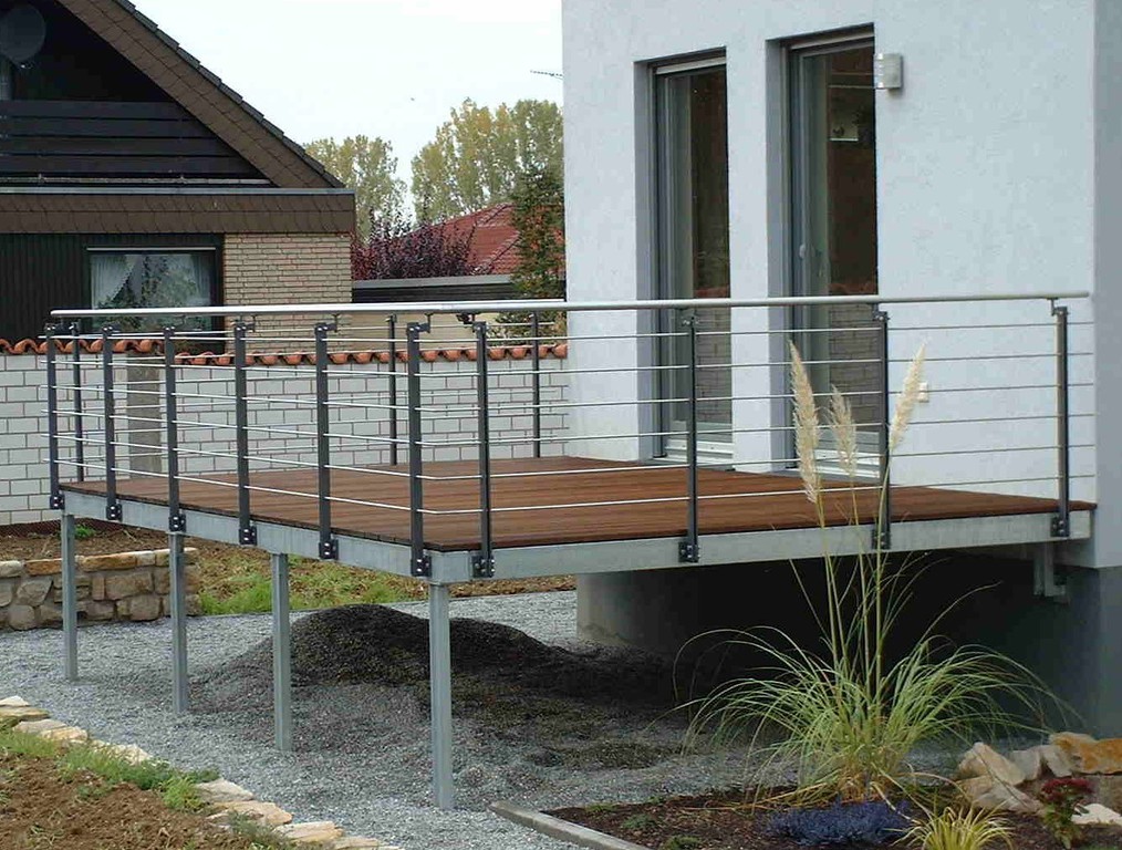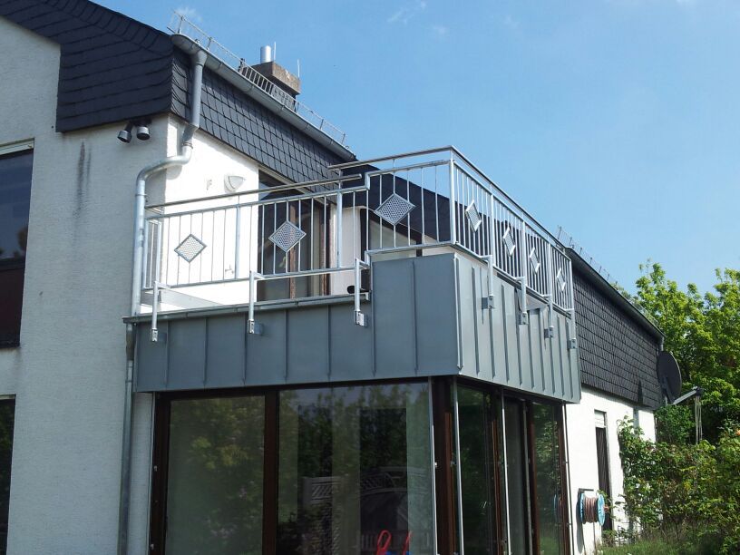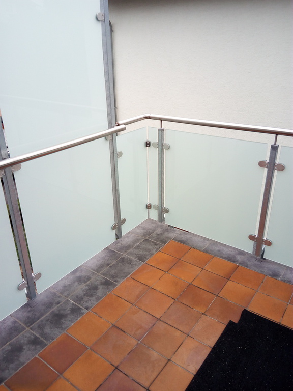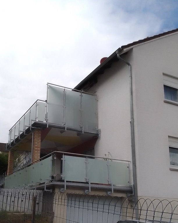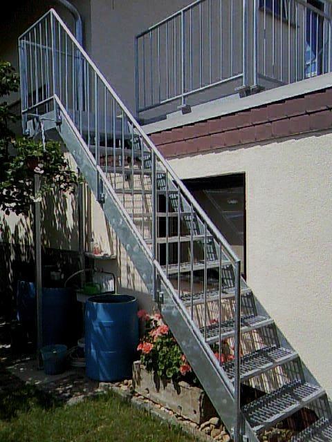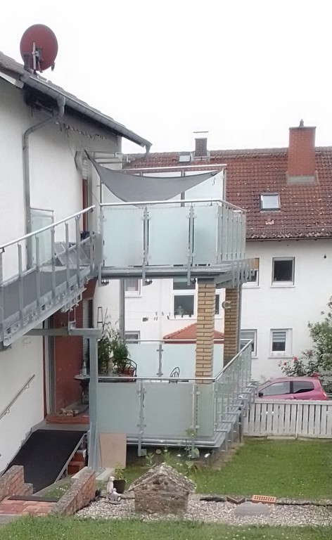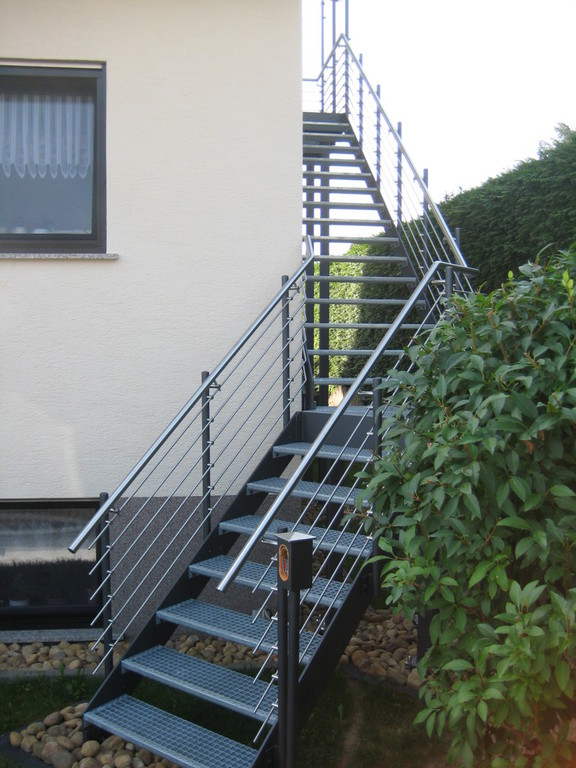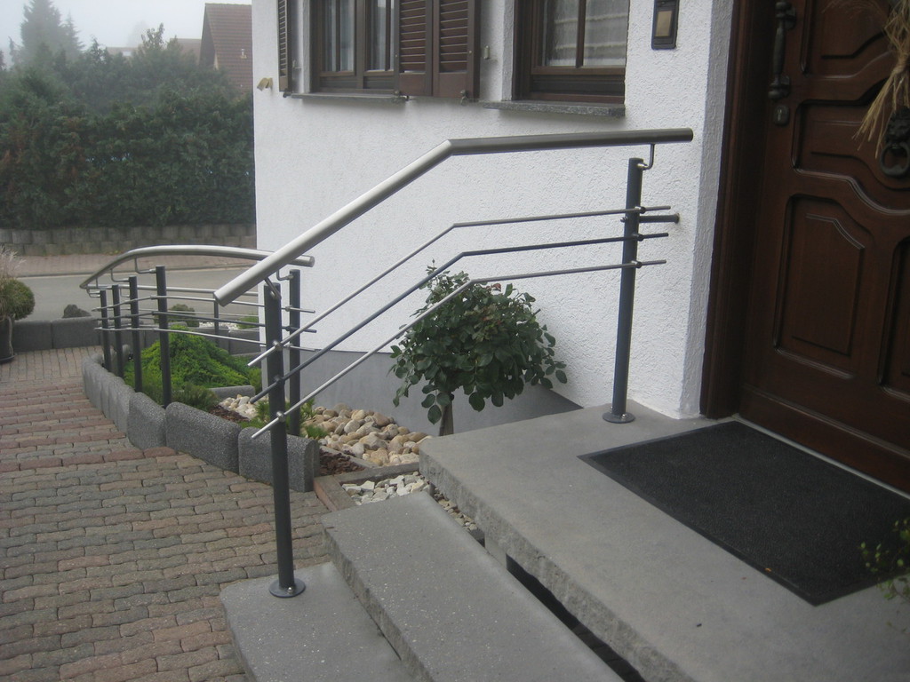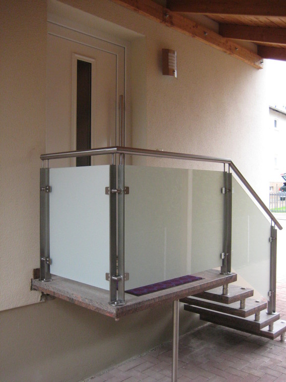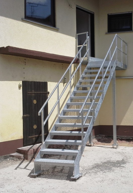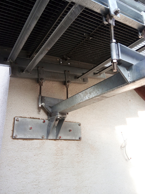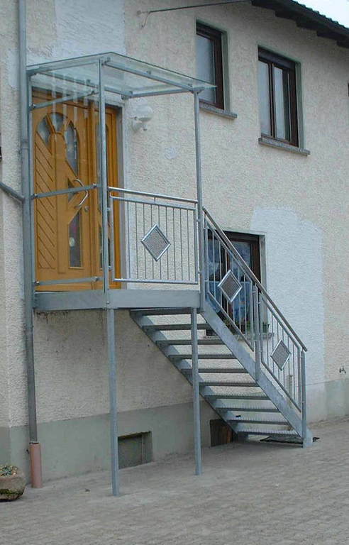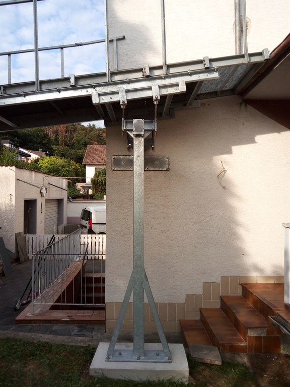 Bilderübersicht über die Anfertigung und die Montage einer Hauseingangstreppe mit Podest aus feuerverzinktem Stahl mit einem Geländer aus Edelstahl rostfrei geschliffen. Belag: Granitplatten Montage durch Steinmetz