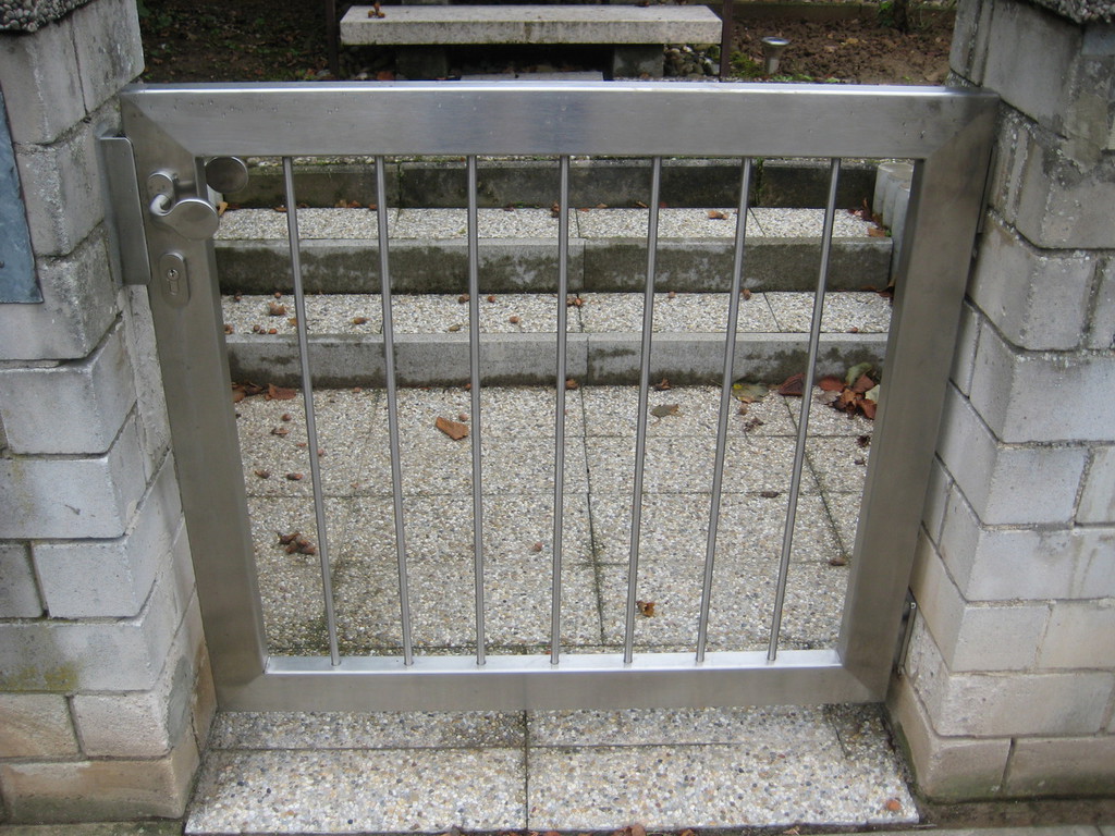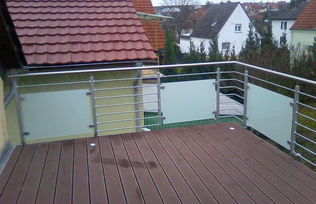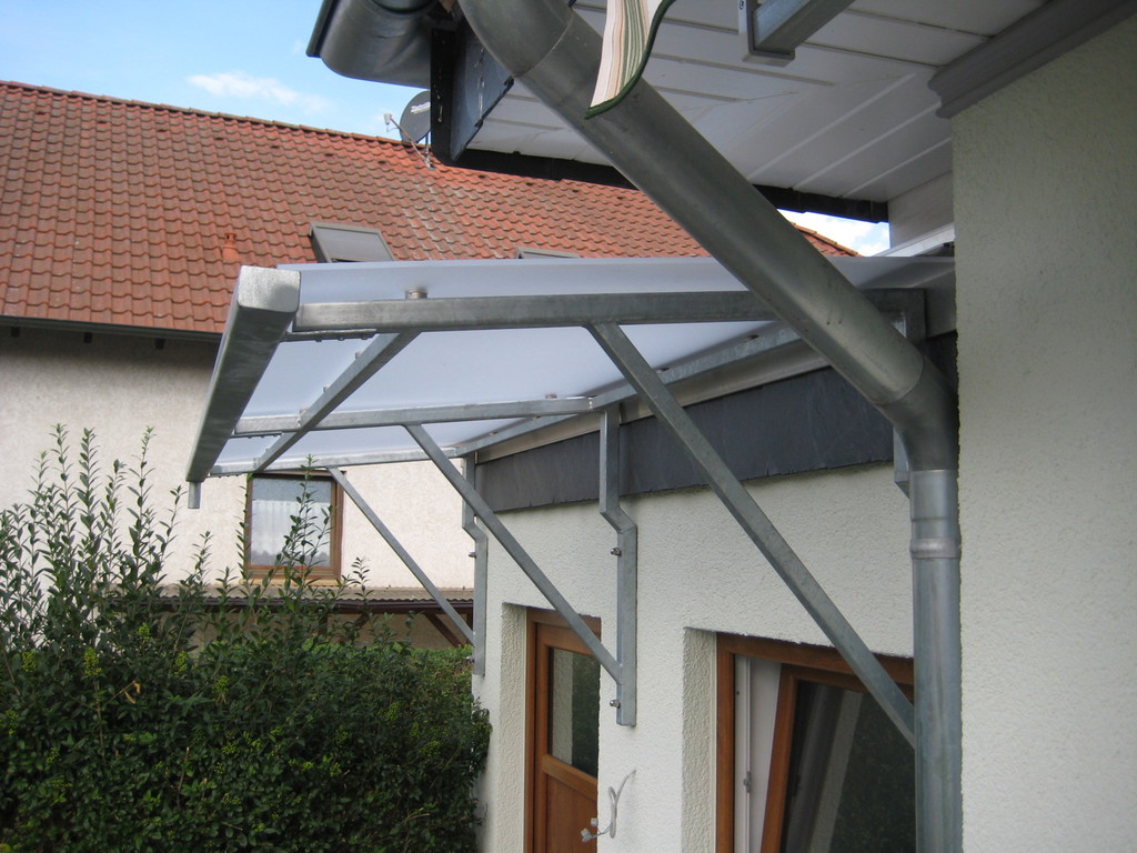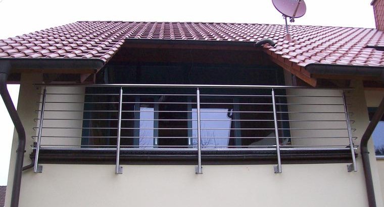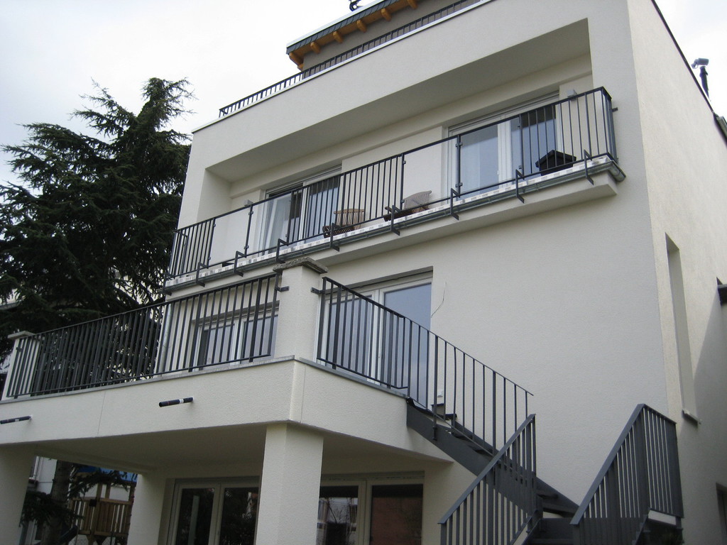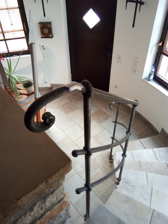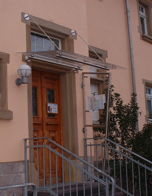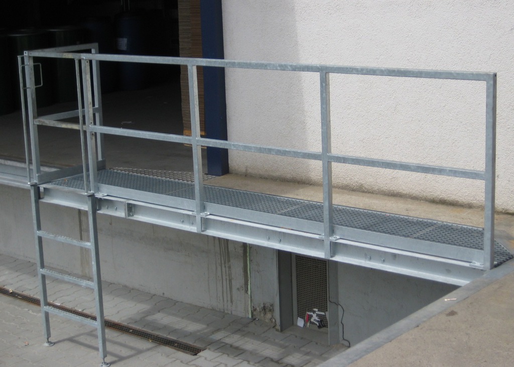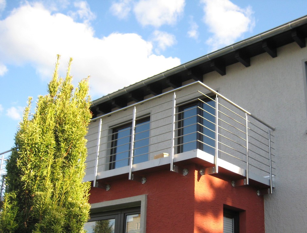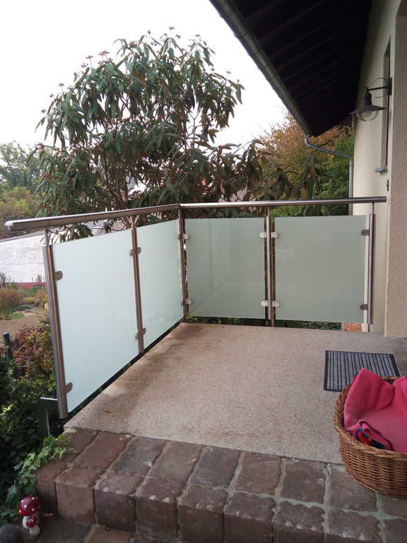 Bilderübersicht über die Anfertigung und die Montage einer Hauseingangstreppe mit Podest aus feuerverzinktem Stahl mit einem Geländer aus Edelstahl rostfrei geschliffen. Belag: Granitplatten Montage durch Steinmetz